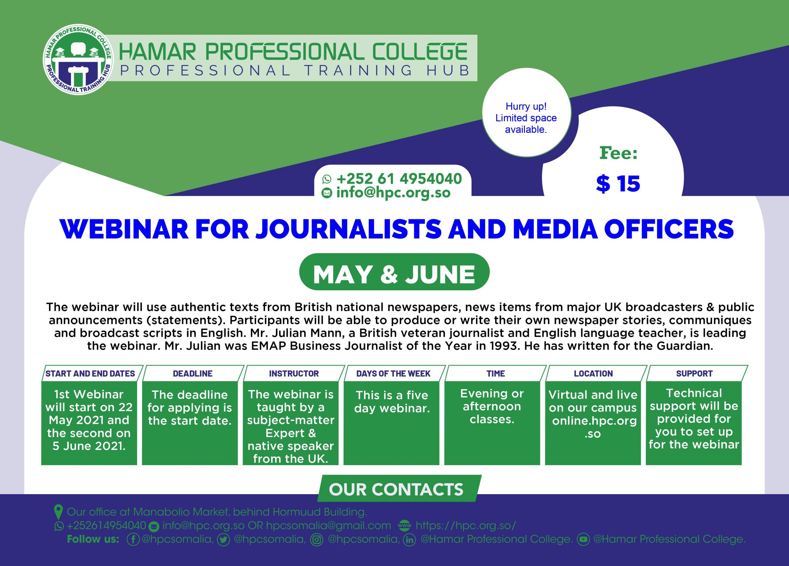 A new webinar about the professional journalism will be held in June 2021 for journos and media officers in private and public institutions.